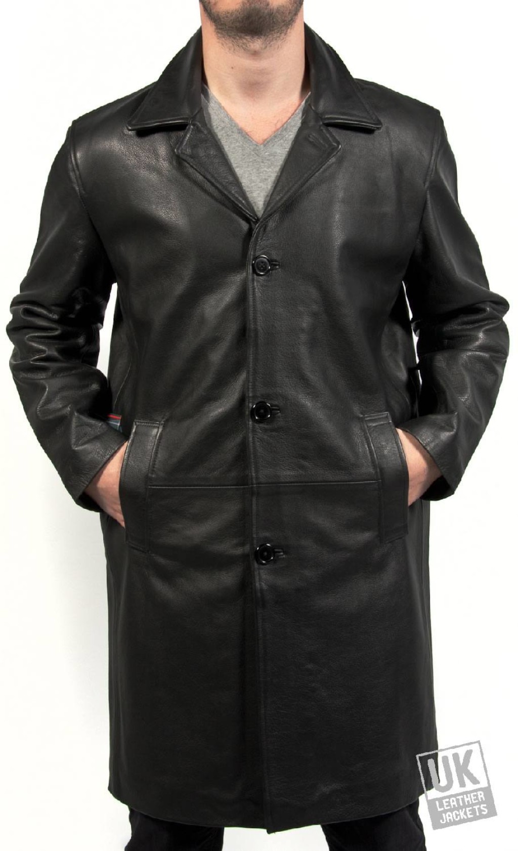 Men's 3/4 Length Black Leather Coat - Plus Size - Henley
